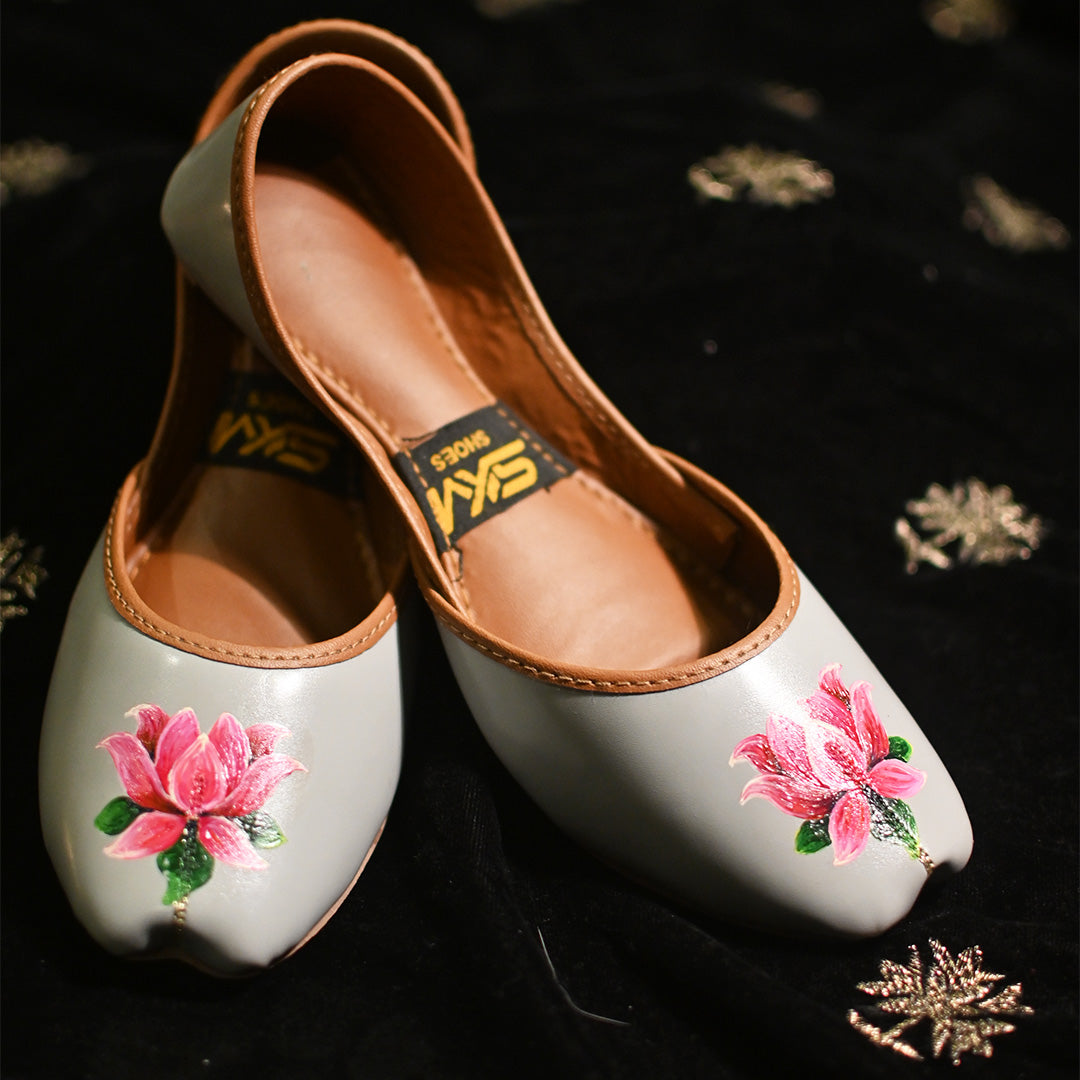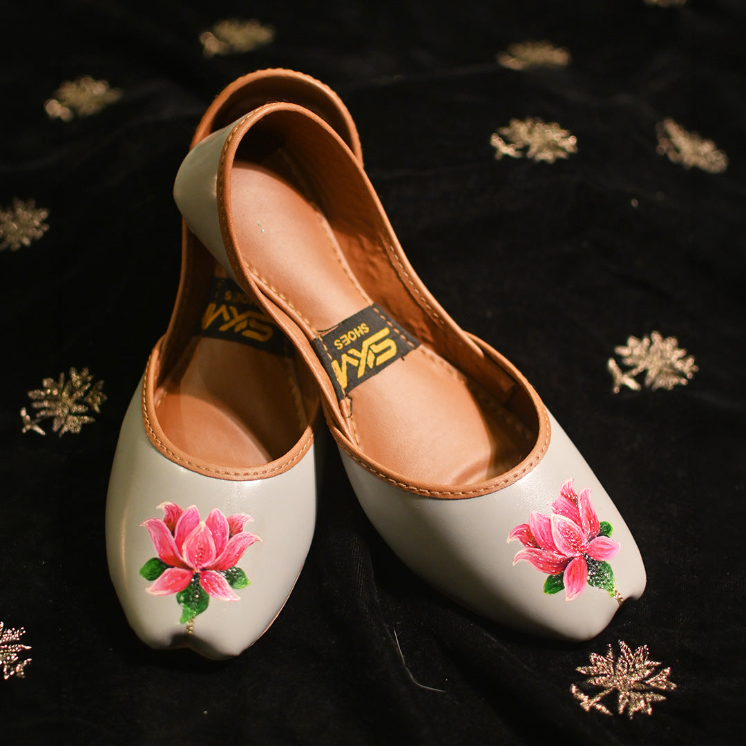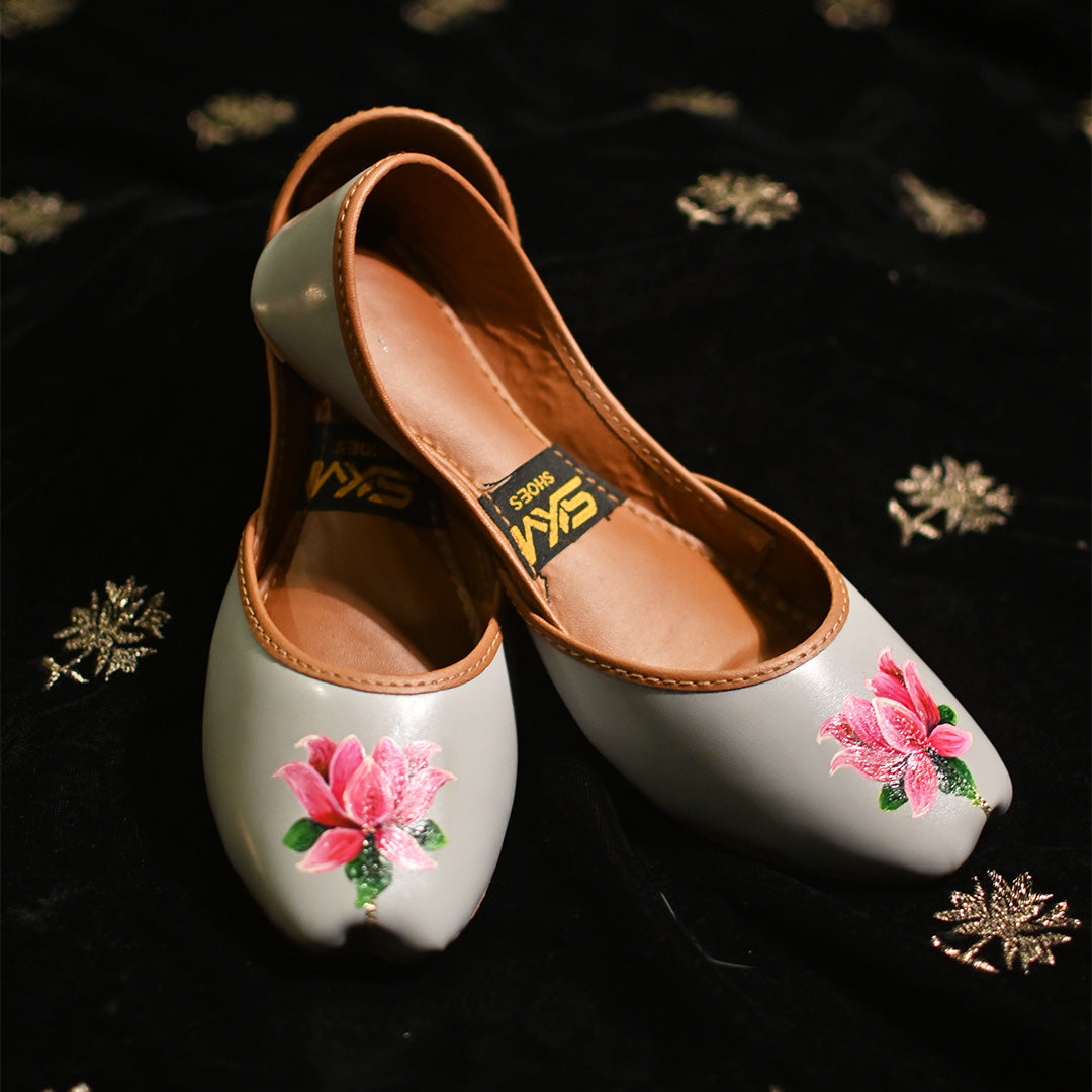 Elegant grey leather khussa adorned with hand‑painted pink rose motifs, blending traditional charm with modern style.