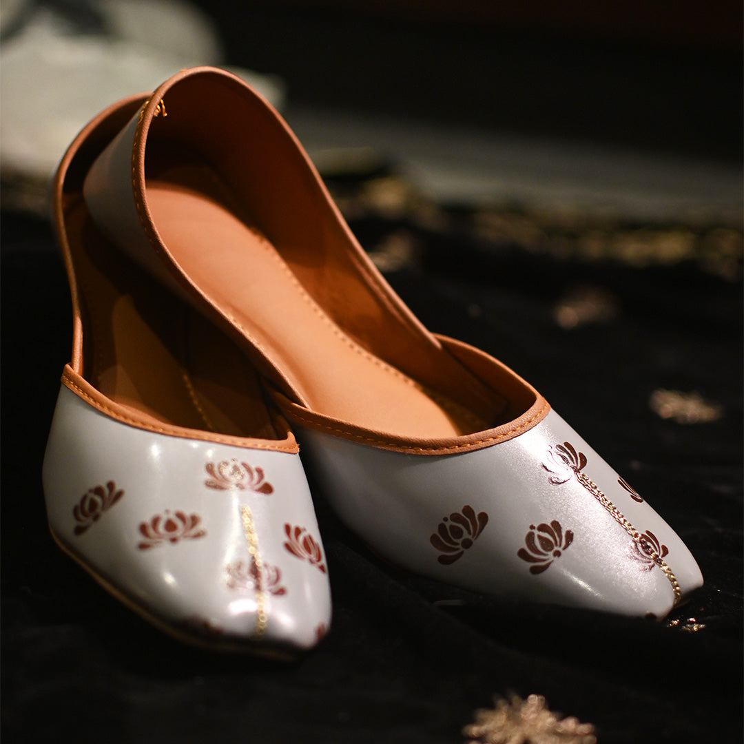 A sleek grey khussa adorned with elegant brown lotus motifs. The soft tan inner lining adds comfort to this stylish, traditional footwear that pairs perfectly with vibrant ethnic outfits.