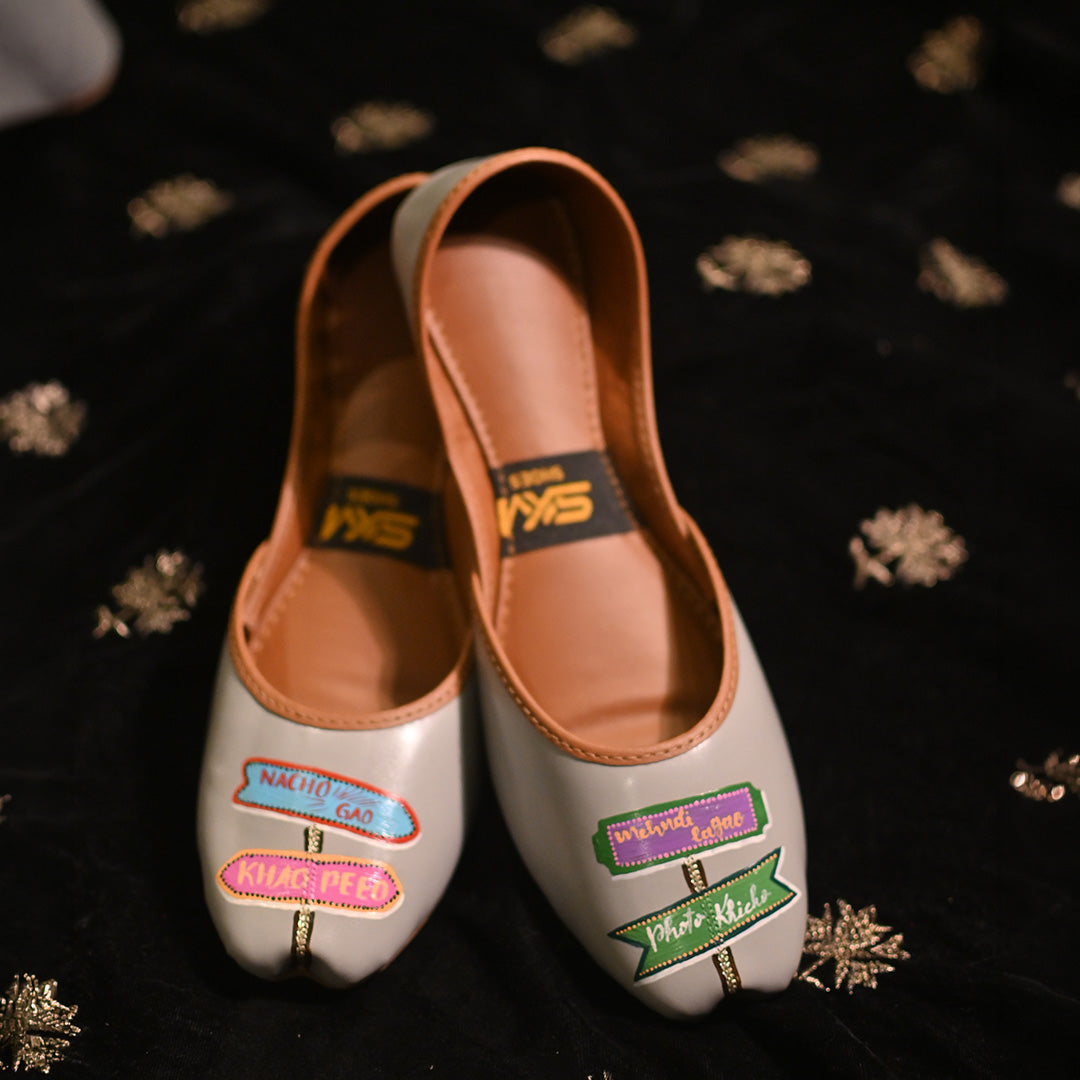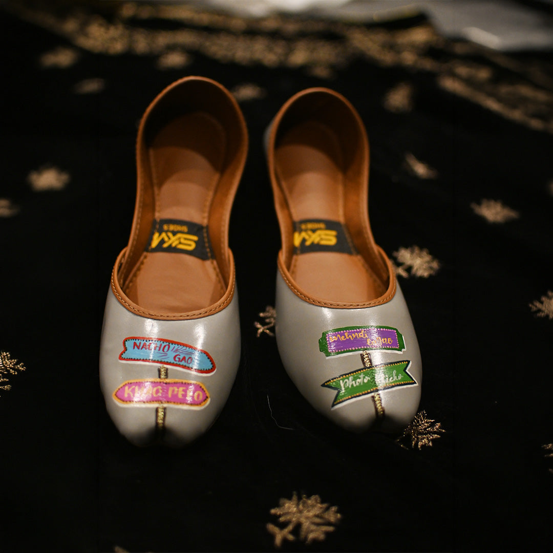 A stylish grey khussa adorned with vibrant, multicolored banner patches that read “NACHO GAO” and “KHAO PIYO”. The design blends traditional craftsmanship with modern street‑art flair, making it a bold statement footwear piece.